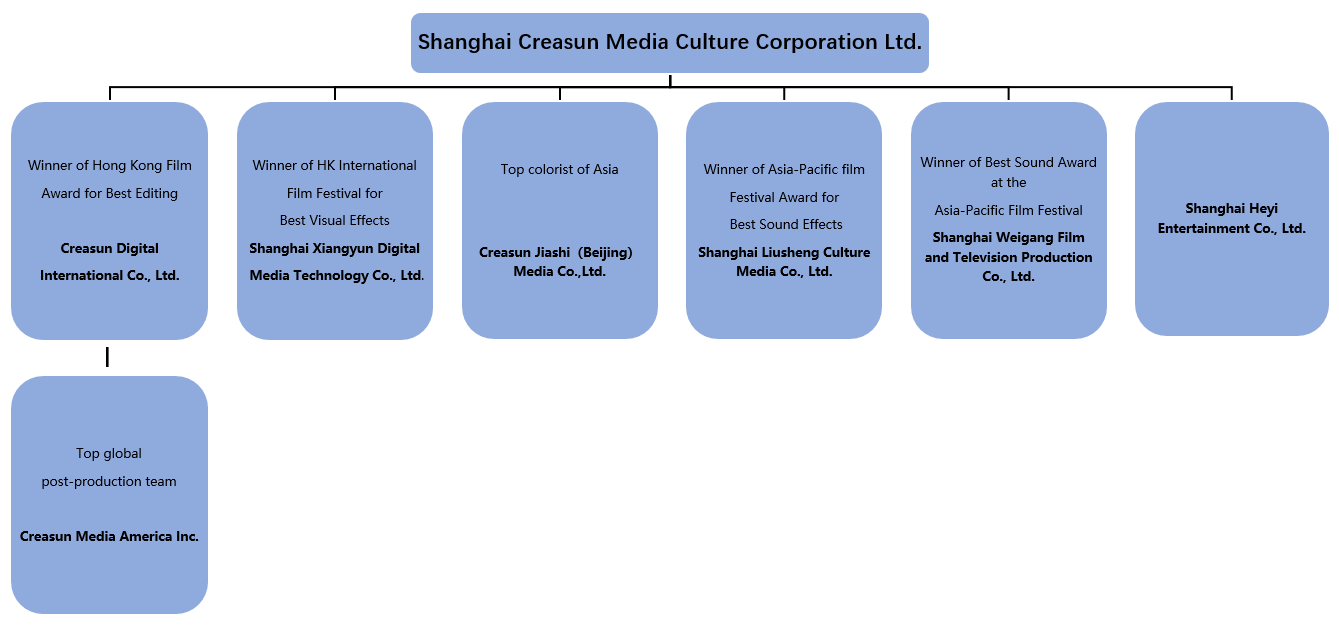 ◆ Shanghai Creasun Media Culture Corporation Ltd. founded in 2007, after more than 10 years of development it has become a film and television technology company, with technology as its core and three main sections which are “technology + content”, “technology + production” and “technology + pan entertainment” as its layout. Creasun Media has subsidiaries which located in Beijing, Hong Kong, and Los Angeles.